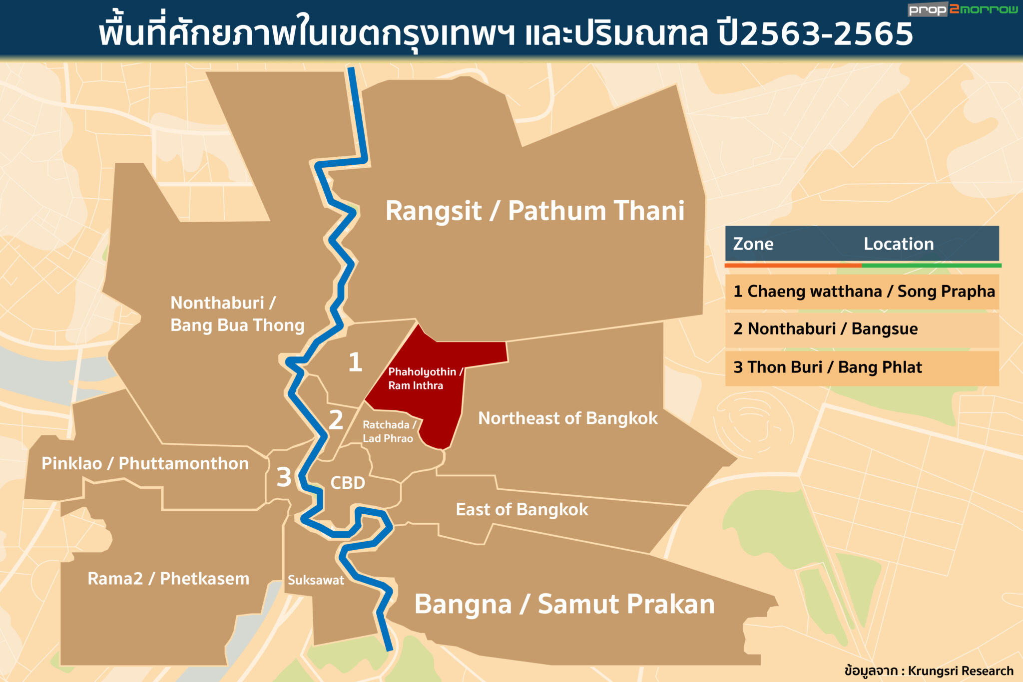 ข้อมูลจากศูนย์วิจัยกรุงศรีประเมินพื้นที่ที่มีศักยภาพในกรุงเทพฯ และปริมณฑลปี 2563-2565 โดยทำเลที่จะเติบโตขึ้นจะเป็นพื้นที่ตามแนวรถไฟฟ้าสายใหม่ 3 โซน และบริเวณใจกลางกรุงเทพฯ อีก 2 โซน ได้แก่